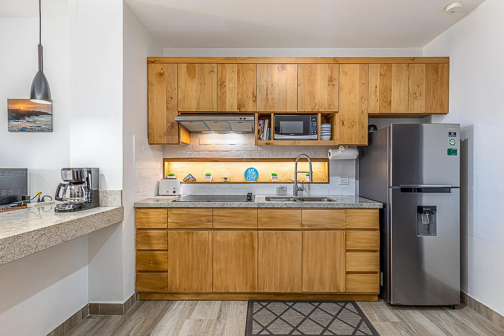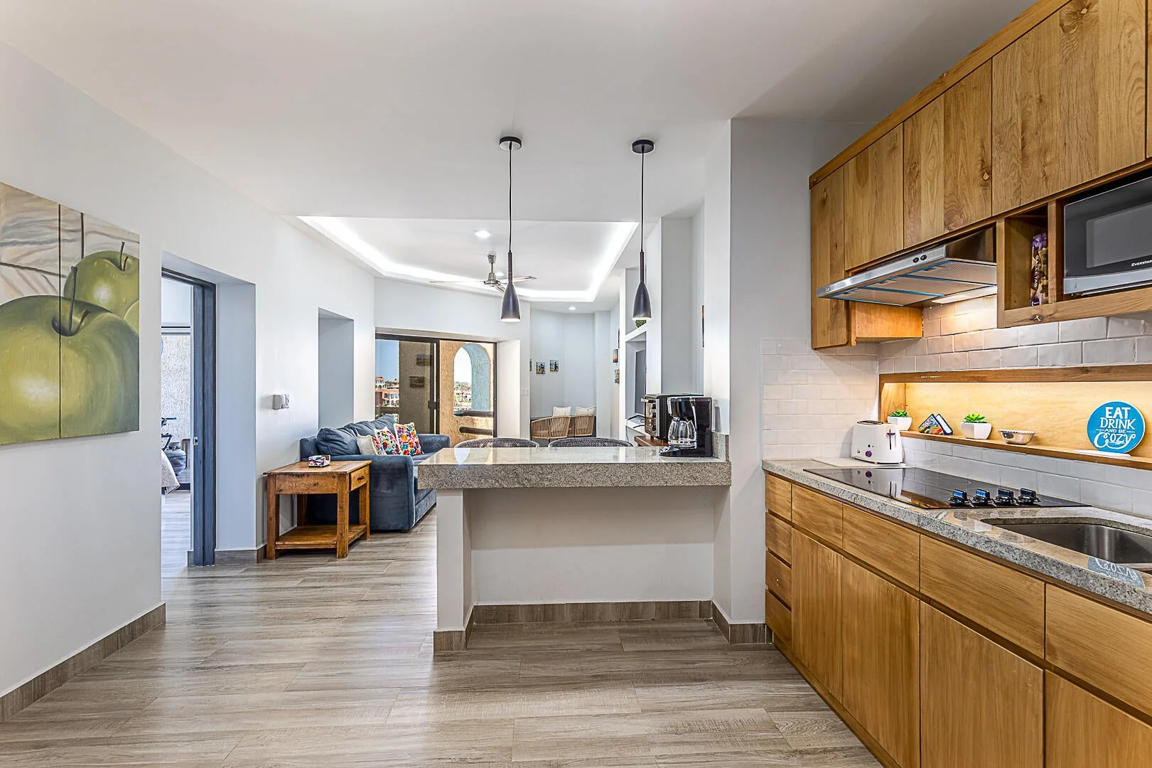 This residence has been thoughtfully configured to highlight natural light and ocean breees. The open‑concept living and kitchen area flows directly to a covered terrace through floor‑to‑ceiling sliding glass doors, creating a cohesive indoor‑outdoor experience ideal for daily living or entertaining.
